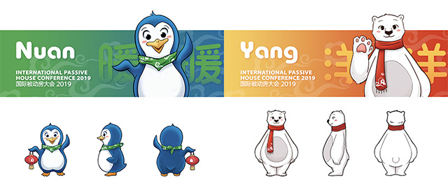 作品的創(chuàng)意靈感來自南極的企鵝暖暖和來自北極的北極熊洋洋的組合,寓意在全球氣候日益嚴峻的當下,來自地球兩級的具有典型代表性的生物攜起手來,共同助力被動房大會這一盛事,呼吁世界各國人民建立并推廣超低能耗建筑,在全球范圍內(nèi)打造健康、宜人、舒適的人類生存環(huán)境。形象創(chuàng)作體現(xiàn)了國際視野,企鵝和北極熊作為極具國際通識力的生物,深受全球人民的喜愛,也很好的吻合了此次大會主題-遍及全球的理念,寓意著希望被動房大會能夠在全球范圍內(nèi)產(chǎn)生影響力、被動房的技術(shù)能夠在世界各國能得到推廣、被動房建筑能夠被廣泛接受并惠及全球,切實幫助人們保護地球環(huán)境,實現(xiàn)可持續(xù)發(fā)展。在創(chuàng)作過程中,團隊不僅創(chuàng)作了暖暖和洋洋豐富的表情、體態(tài)、互動關(guān)系,也將中國元素中吉祥元素糅合在吉祥物的形象特征中,呼應(yīng)了其在中國舉辦的地域性特征,使其更釋放出中國活力。北理工設(shè)計團隊在后續(xù)任務(wù)中將繼續(xù)創(chuàng)造一系列視覺形象拓展與工業(yè)設(shè)計應(yīng)用,為大會的成功舉辦提供設(shè)計力支撐。隨著被動房盛會的臨近,我們會陸續(xù)的在機場、地鐵等公共場所看到這些形象。