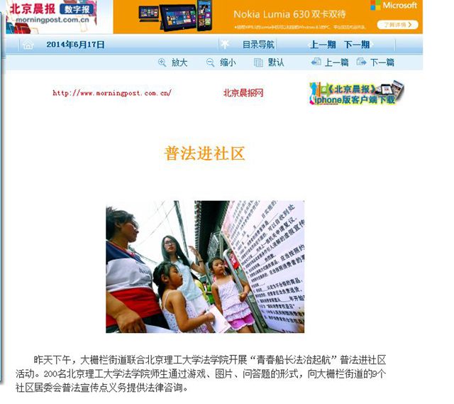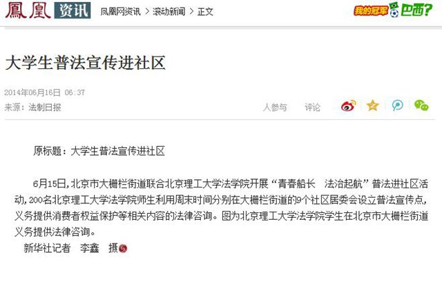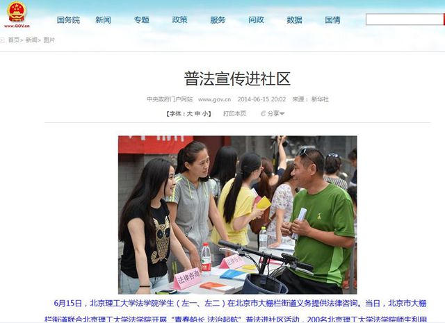 6月15日,北京理工大學(xué)法學(xué)院200余名師生黨員普法志愿者來到大柵欄街道開展系列普法宣傳活動(dòng),通過組織普法好聲音文藝演出、普法有獎(jiǎng)問答、法律咨詢等方式為胡同里的居民們送來法律知識和法律服務(wù)。新華社、中國政府網(wǎng)、科技日報(bào)、鳳凰網(wǎng)、新浪網(wǎng)、中國網(wǎng)以及北京市教委官方微博等媒體先后發(fā)布或轉(zhuǎn)發(fā)了本次活動(dòng)的新聞報(bào)道。