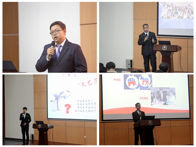 機械與車輛學院機械先鋒隊從也門撤僑事件入手,與印度撤僑進行了對比,結合社會主義核心價值觀的踐行,提出了踐行社會主義核心價值觀要實現理性崛起的命題。人文與社會科學學院青馬講師團采用“鏘鏘三人行”節目訪談的新穎形式,印證了延安精神與社會主義核心價值觀在校園中的傳承和踐行。光電學院的華光社以“尋理工足跡,傳京工文化”為題,以延安為源頭,為同學們深入解讀了北京理工大學的校史和校園文化精神。計算機學院新青年隊以“普世價值的廣泛性與西方制度的局限性”為題,闡釋了普世價值與西方制度的根本區別。