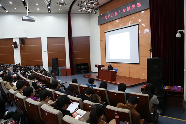 在兩個多小時的黨課中,李和章詳細講解了《論語》的“學而篇”與“為政篇”。“學而篇”講到,做學問,就是在工作生活中隨時隨地思想、實踐、反省、體悟做人做事的道理;“本立而道生”,其根本就是中國共產黨人的信仰、理想、信念、宗旨;以三面鏡子自省吾身;敬事而信;自重,過則勿憚改;溫良恭儉讓;言行一致;和為貴;巧言令色,鮮矣仁;對不義之富與貴,如“浮云”;敏事慎言齊賢正己;做學問,要切磋琢磨,往深處挖掘探討等。“為政篇”講到,以己德、制度、“無邪”為政;“無違”人民意愿,體驗百姓之憂,誠敬百姓、恭敬百姓;做事情,要提高自覺性、激發主動性、增強創新力(“足以發”);“先行其言而后從之”,“空談誤國、實干興邦”;做人,要平淡平實,允文允武,大器有才干;“團結”不“勾結”,不搞團團伙伙;學而思、思而學,多聞多見;“莊重、孝慈、舉直、舉善、誠信、義勇”等,進一步加深了師生黨員對“三嚴三實”的理解與認識,有助于提升師生黨員的“三嚴三實”的文化自覺,有助于提高師生黨員的黨性修養。