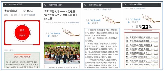 2016年12月9日15:30,光電學院“弘揚紅色文化,青春感動你我”團日活動報告暨頒獎大會在綜教A205舉行。5個團支部代表分別做了成果分享:04241401支部講述了青年繼承與發揚長征精神的重要意義;04011605支部展現了網絡原生民應如何面對新媒體時代;04011608支部以緬懷先烈活動弘揚長征精神;04011506支部詮釋了感恩與付出的關系;04011606支部講解了學“習”講話的重要意義。全體同學共同觀看了04241401團支部青春微團課視頻。