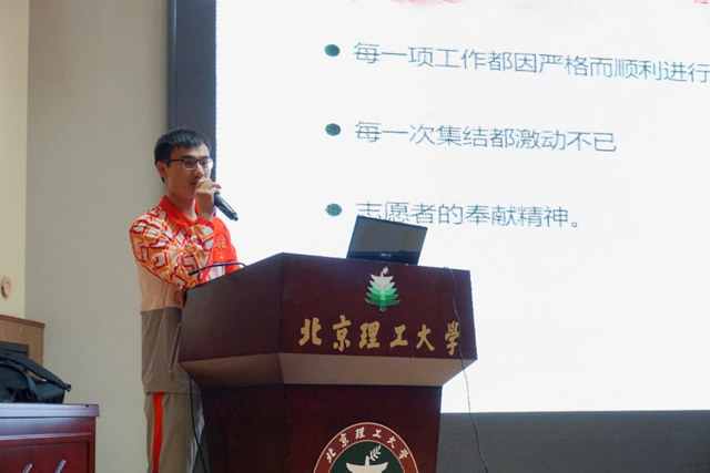 餐包服務志愿者代表、材料學院兼職輔導員蔡懷建講述了他的親身經歷,他從“我們是誰”“我們做了什么”“我們怎么做的更好”和“我們的感想與收獲”四個方面展現了他們作為餐包服務志愿者的工作,從視頻培訓到實地演練,為了在國慶當天有更好、更高效率的表現,餐包服務志愿者們認真訓練、不怕苦累,在實戰中磨練,在演練中提升,最終圓滿完成保障補給任務。