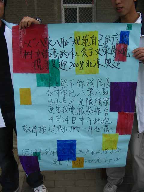 2006年4月24日,管理與經(jīng)濟學院共產(chǎn)主義學習會在京工食堂的對面舉辦了“榮辱卡帶身邊,好習慣伴我行”贈送“榮辱卡”活動。此次活動是管理與經(jīng)濟學院共產(chǎn)主義學習會響應中共中央關(guān)于宣傳八榮八恥,樹立社會主義榮辱觀的號召,向全校師生發(fā)出倡議以八榮八恥規(guī)范自身言行的系列活動之一。漂亮的小卡片一發(fā)出便受到同學們的關(guān)注和喜愛,以貼心的方式向全校師生發(fā)出倡議,此次活動取得了良好的效果。