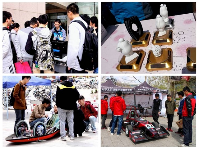 下午的學生科技創新成果展覽中,共分為學生科協培育作品、“3D打印”體驗展示、學院三大車隊(方程式賽車、節能車、智能車)等展區。學生科協培育作品展區展出了學院的16項學生科技創新作品,同時開展了學生科協形象宣傳活動,增加了同學們對學院學生科協的了解。在“3D打印”體驗展區,學院學生科協安排專人進行了詳細講解,讓同學們觸摸新科技,此外,還對前期“3D打印方案設計大賽”中的優勝者現場打印其設計作品。“黑鯊Ⅴ”汽油機方程式賽車、純電動節能賽車以及光電、電磁、攝像頭三種類型的智能小車贏得了廣泛關注,現場的同學中有很多是慕名而來,并在現場提交報名材料希望能夠加入車隊。
