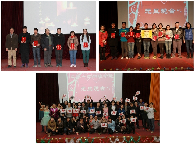 晚會期間,為獲得2012-2013學年物理學院何丕應獎學金的五名同學進行了頒獎,以何丕應老師的精神鼓勵同學們勤奮學習、踏實做人;為物理學院夢想基金學生運行團隊頒發了團體奉獻獎,以鼓勵他們在學校首個學生自管的獎學金項目中的貢獻和付出。