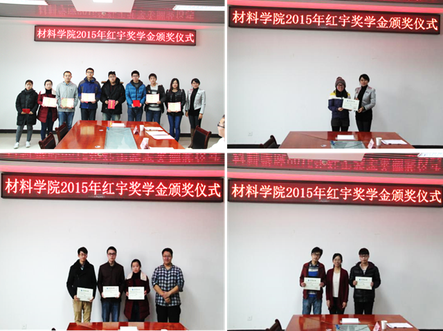 接著,頒發了材料學院2015年度紅宇優秀學生干部獎學金和紅宇暑期社會實踐優秀團隊獎。紅宇獎學金是由重慶紅宇靜謐工業有限責任公司捐資設立,用于獎勵學習態度端正,工作能力強,在學習、日常行為和科研工作中起模范帶頭作用的材料學院學生干部和獲得2015年材料學院暑期社會實踐優秀團隊的集體。