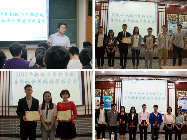 2016年9月20日、21日,機械與車輛學院2016年暑期社會實踐成果報告會分別在車輛實驗樓報告廳(中關村校區)、理學樓B206(良鄉校區)順利舉行。此次報告會圍繞青年服務國家及學校“青年服務國家—投身助力十三五,青春奮進中國夢”主題展開,學院黨委副書記副院長范文輝,團委書記郝佳馨,團委副書記李超,2014級本科生輔導員程繼超,2015級本科生輔導員馬凱,2016級輔導員張兆鵬,學生生涯發展服務中心主任張雨甜、副主任周雪,專職輔導員武穎,往屆優秀社會實踐團長彭浩然及部分2016級本科新生參加了報告會。